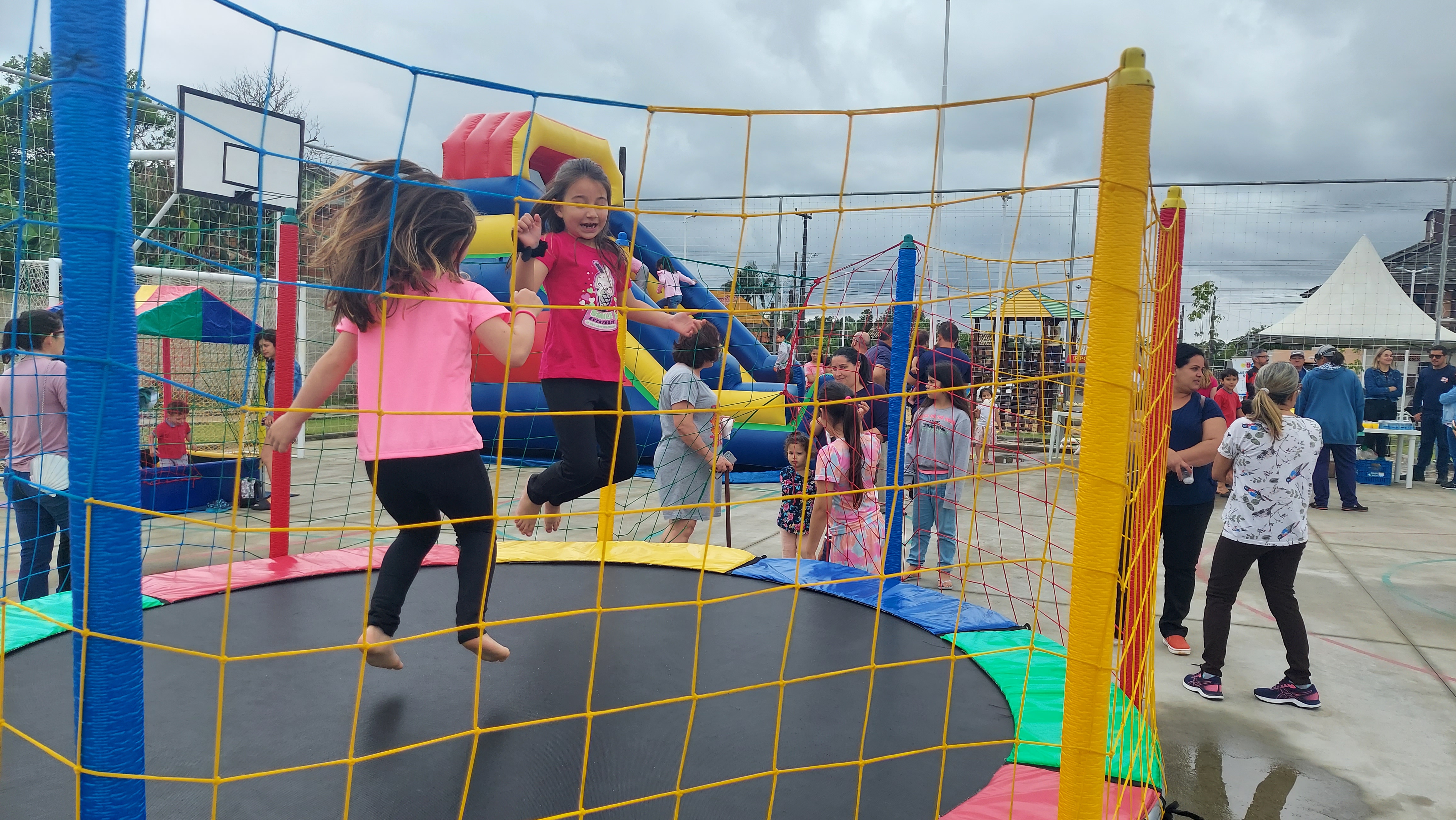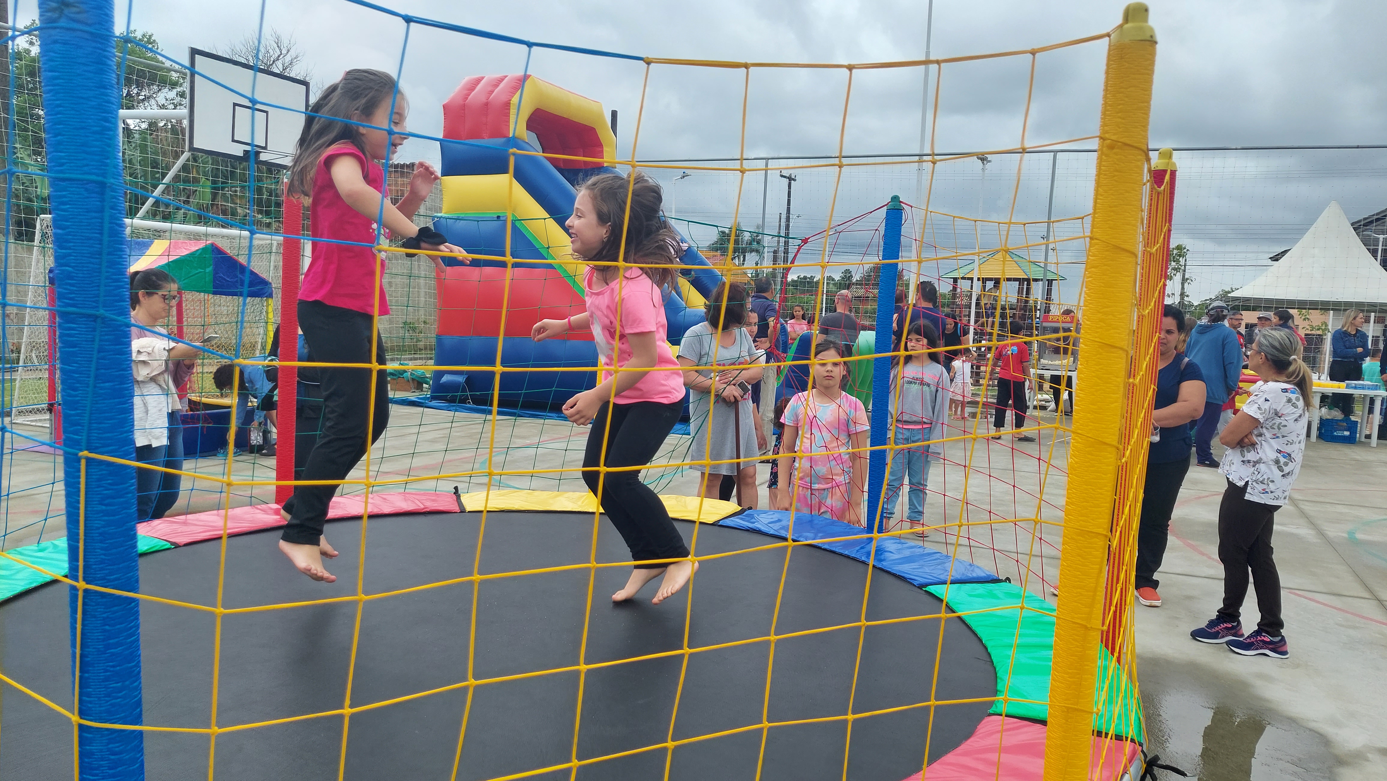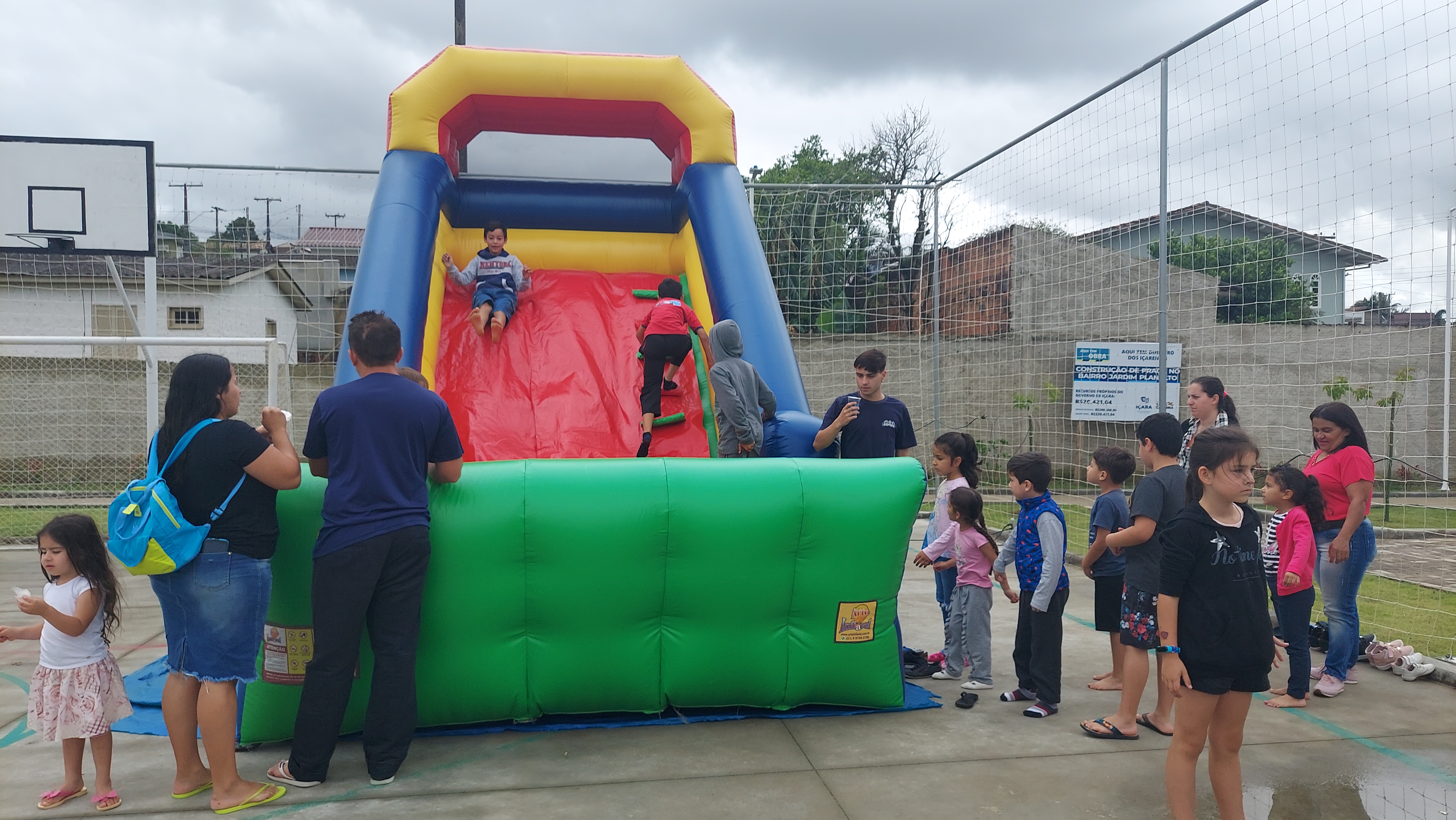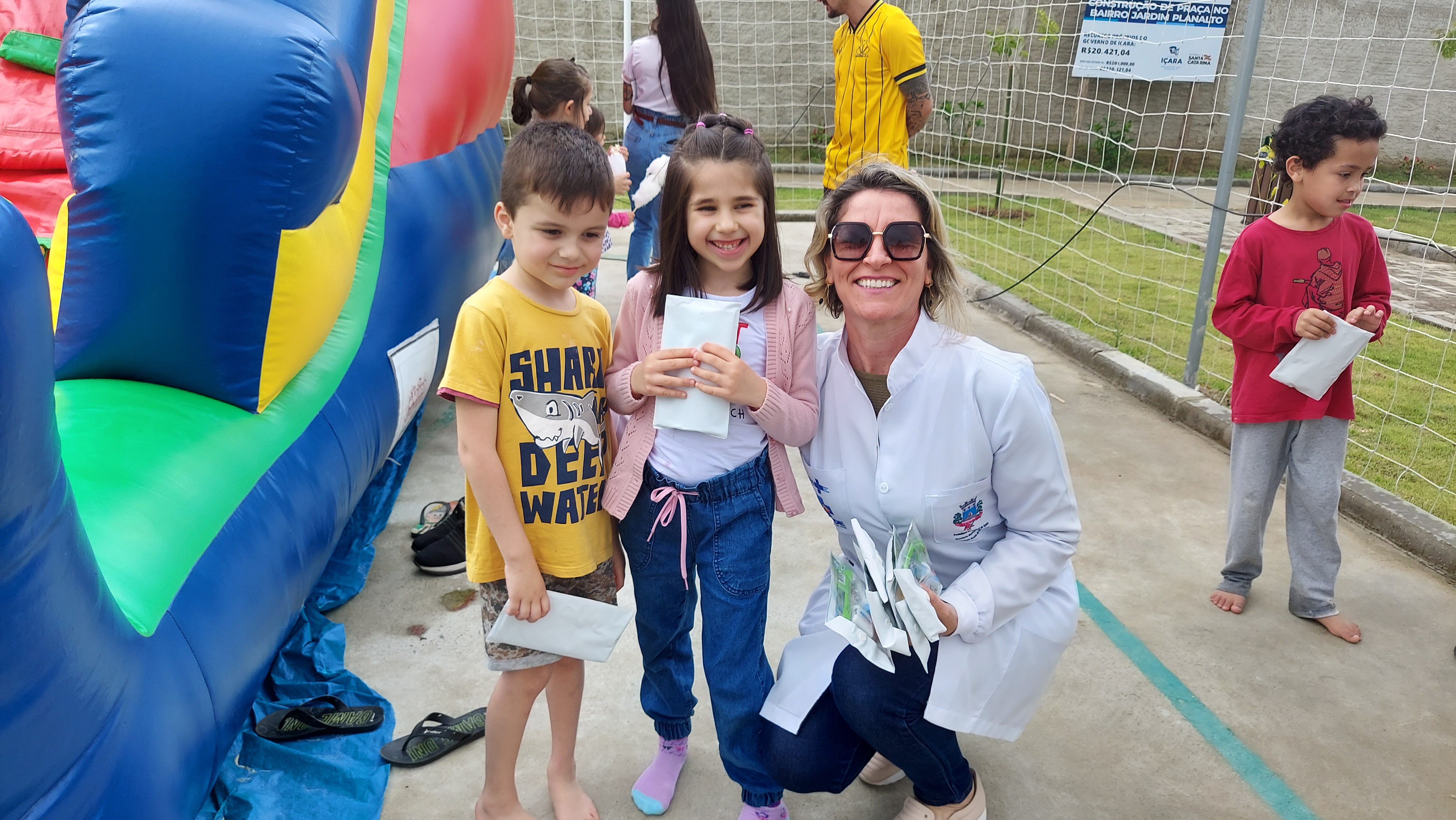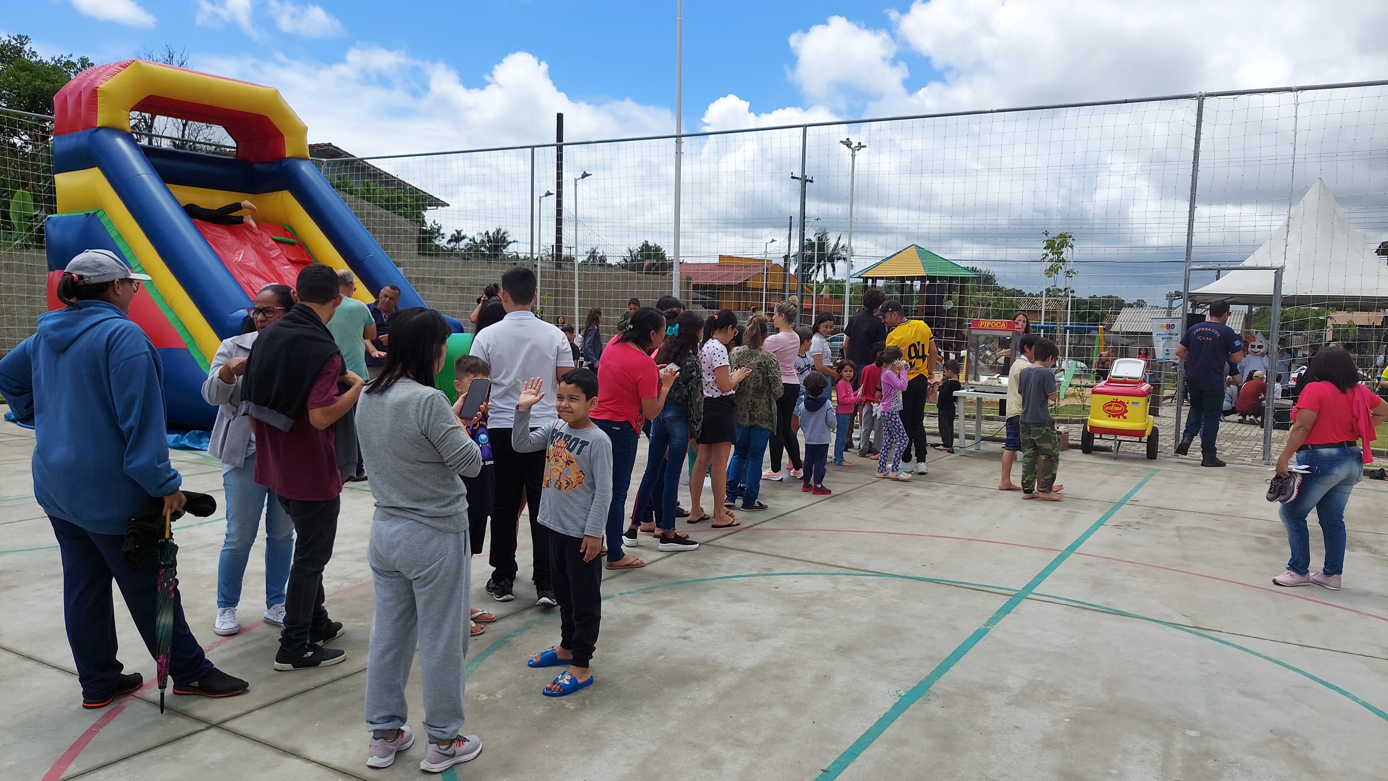 Durante toda a manhã, mesmo com o tempo instável, a comunidade participou efetivamente da ação integrada que envolveu as secretarias de Assistência Social, Habitação, Trabalho e Renda (brinquedos infláveis, piscina de bolinha, pipoca, sucos, picolé e algodão doce); Fundai (distribuição de mudas de árvores frutíferas, FME (atividades esportivas) e Saúde (orientações e distribuição de kits de higiene bucal).